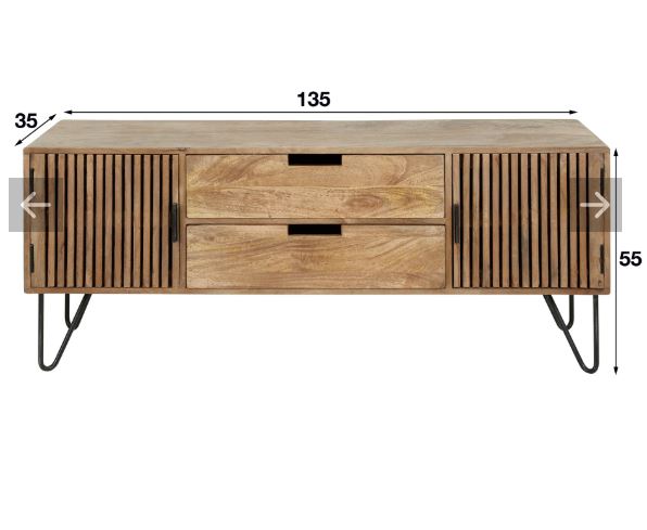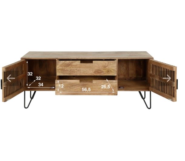 Bordet döljer alla saker runt din TV bakom antingen två massiva trädörrar eller i de två praktiska lådorna i mitten av möbeln.