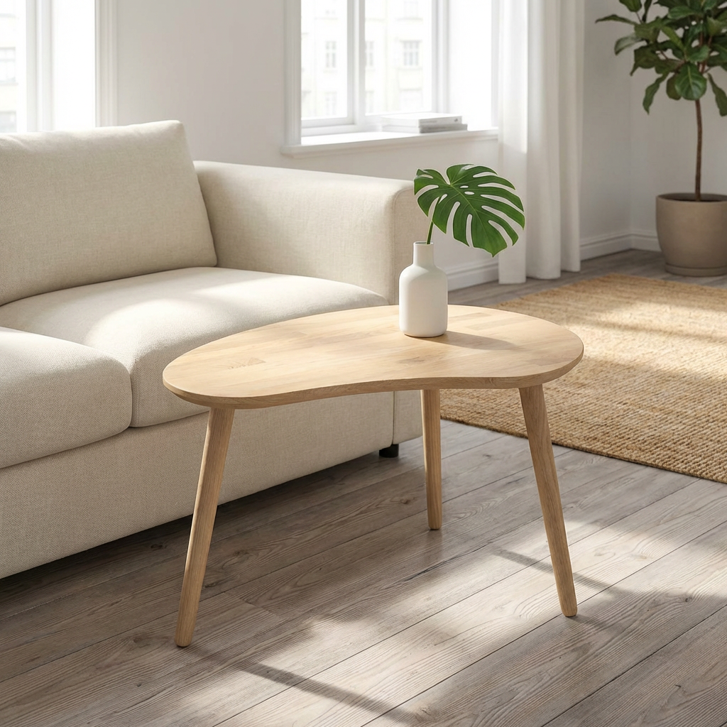 Här säljs vår pallformade modell i massiv ek med storleken 74 x 55 cm. För detta kan du välja mellan tre olika benhöjder, och mellan fem olika ytbehandlingar för bordet.