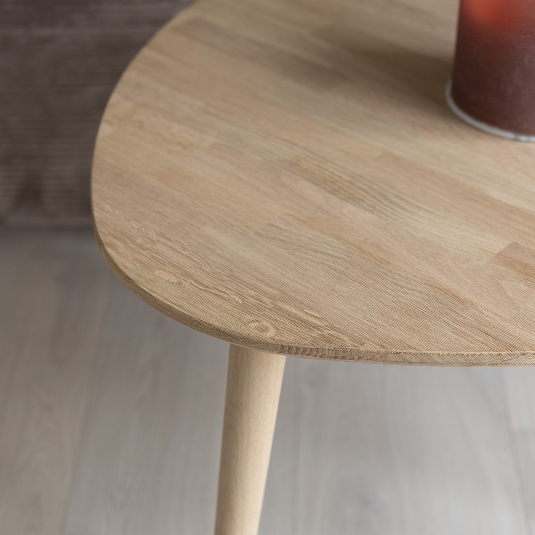 Här säljs vår pallformade modell i massiv ek med storleken 107 x 79 cm. För detta kan du välja mellan tre olika benhöjder, och mellan fem olika ytbehandlingar för bordet.