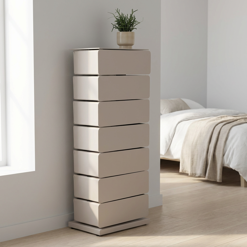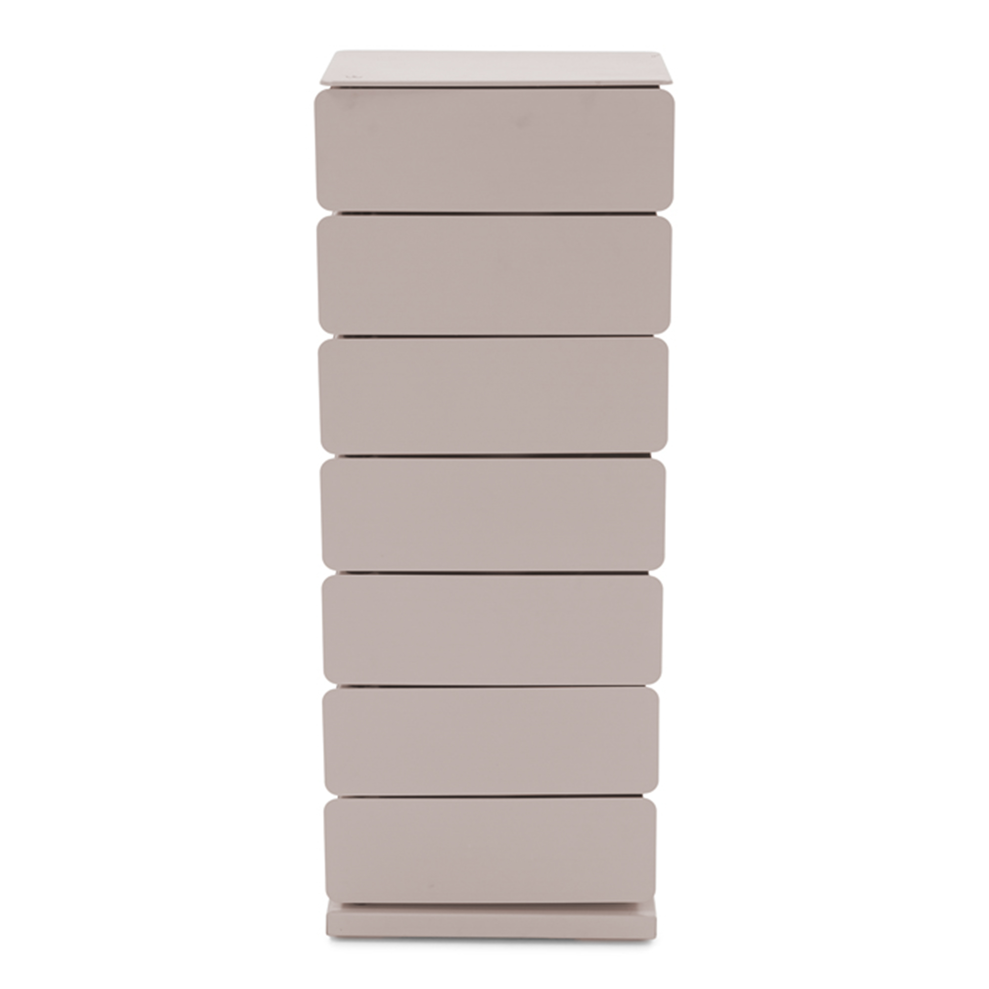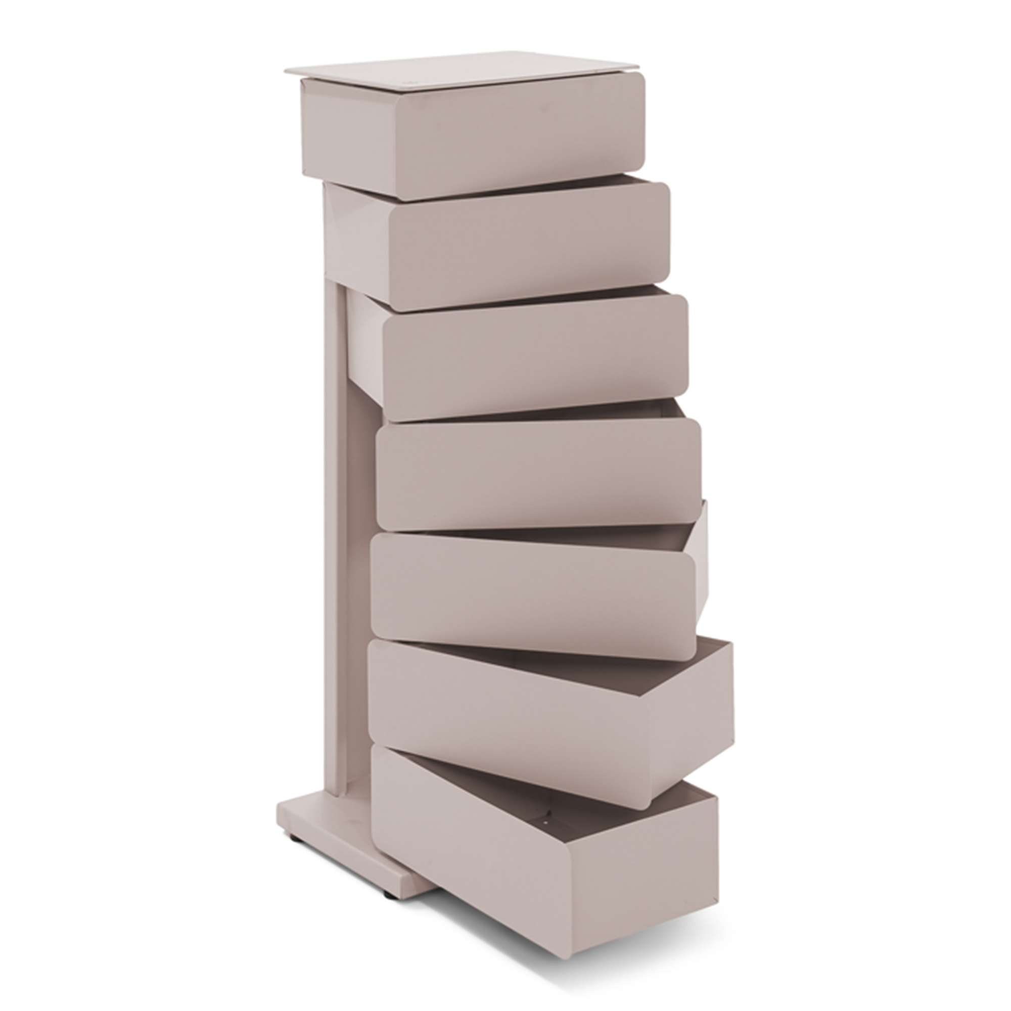 Byrån har sju lådor som alla kan svängas ut ur byrån så att innehållet i lådan är lätt att nå.