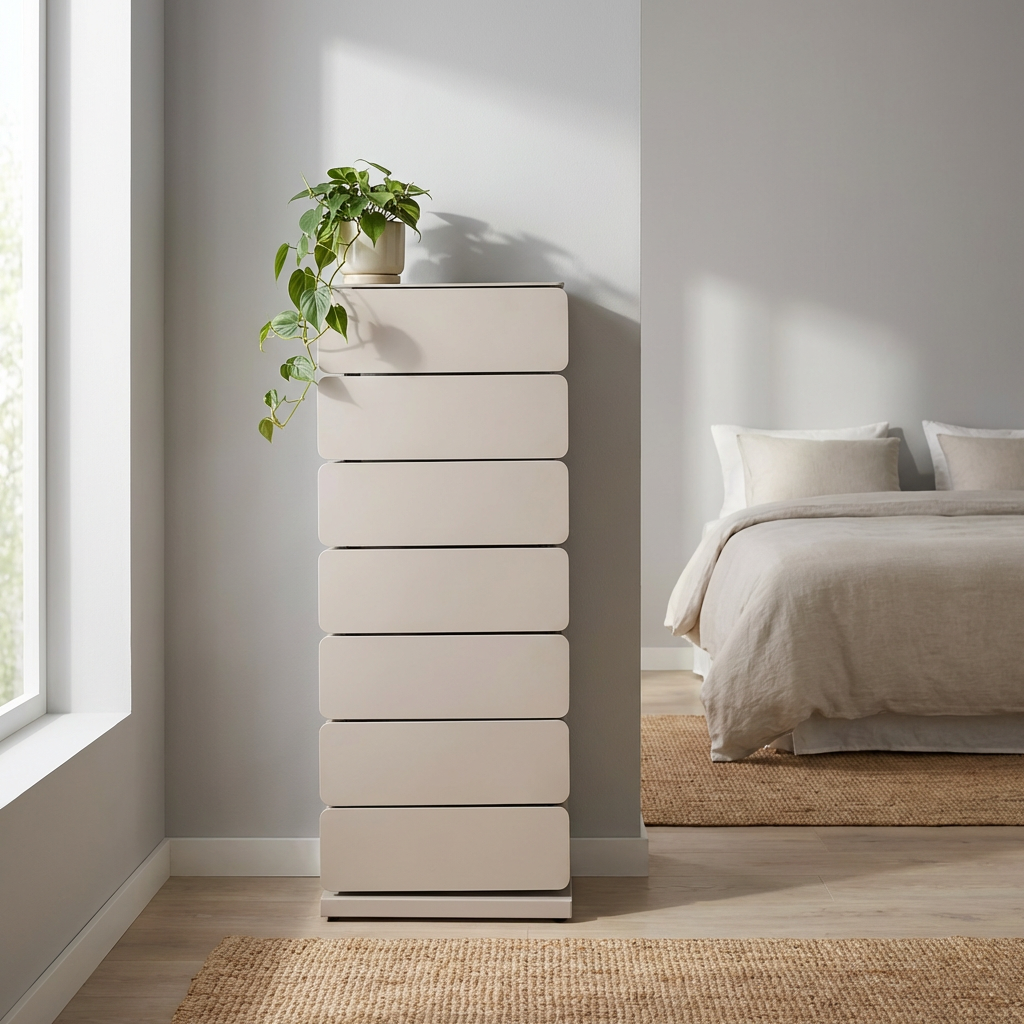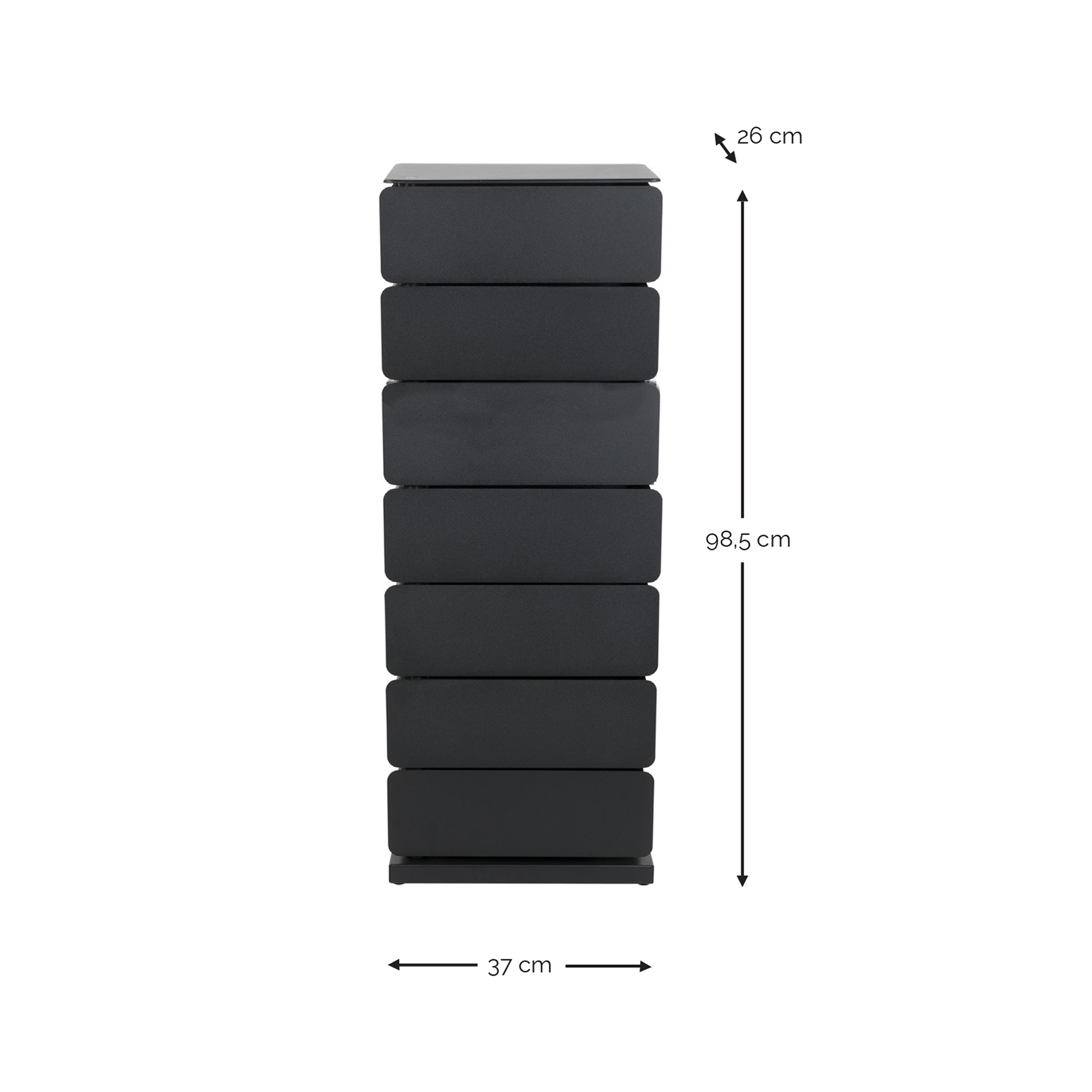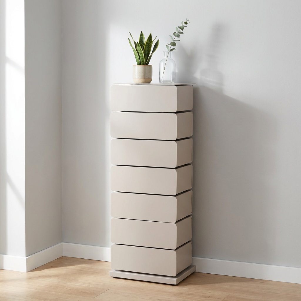 Byrån har sju lådor som alla kan svängas ut ur byrån så att innehållet i lådan är lätt att nå.