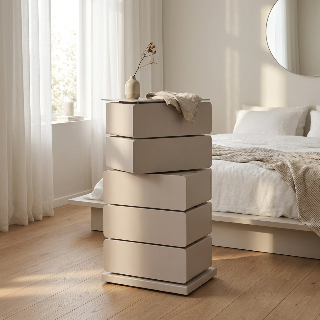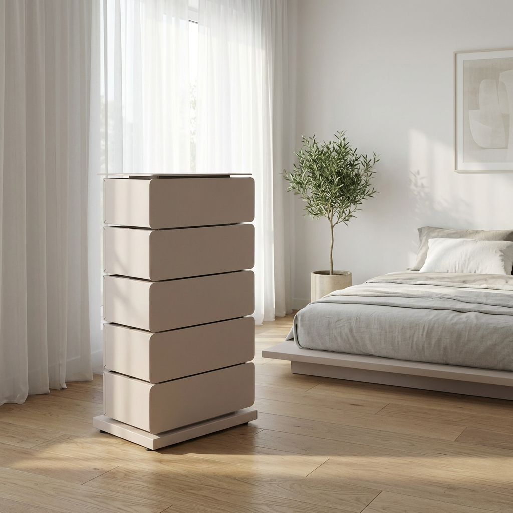 Byrån har fem lådor som alla kan svängas ut ur byrån så att innehållet i lådan är lätt att nå.