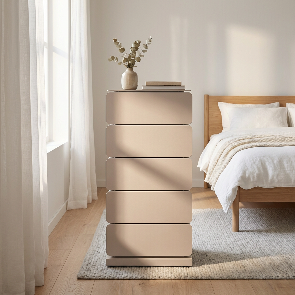 Carson är den supertrendiga minimalistiska byrån i silkeslen taupefärgad metall.