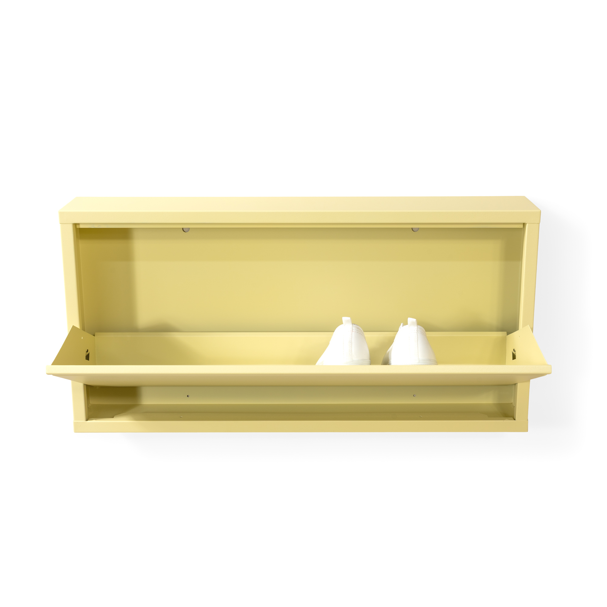 Zapato är ett elegant mindre skoskåp i ljusgul metall som löser problemet med skor som ligger runt i entréhallen.