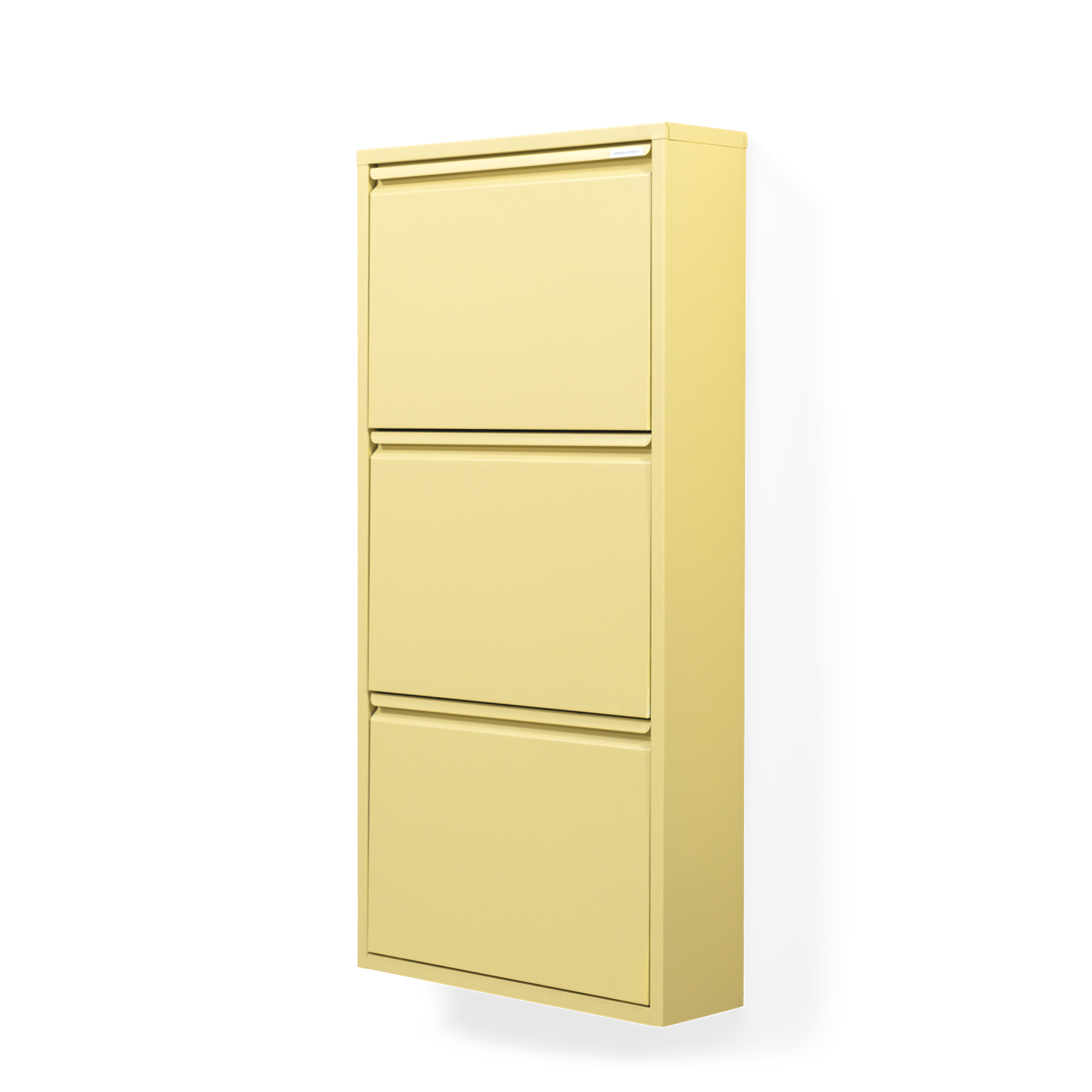 Zapato är ett elegant skoskåp i ljusgul metall som löser problemet med skor som ligger runt i korridoren.