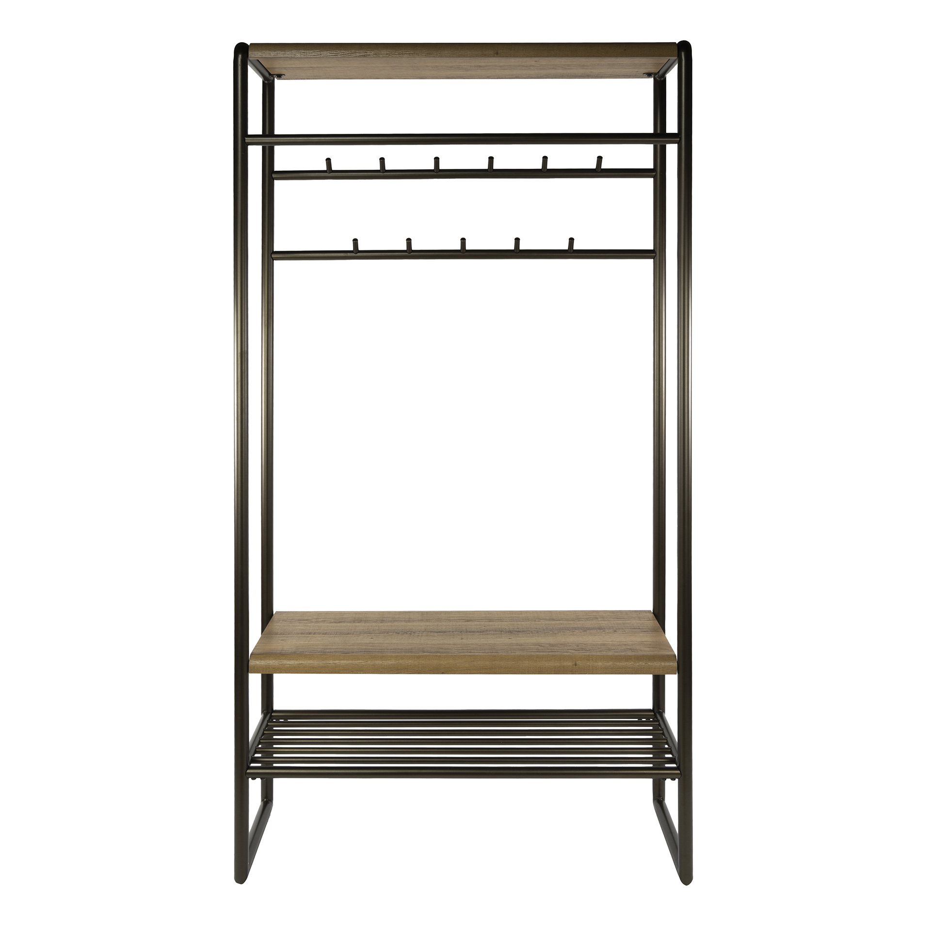 Klädställningen har skohyllor, 11 krokar för att hänga kläder, en rund metallstång för att hänga kläder och en hylla högst upp för diverse förvaring.