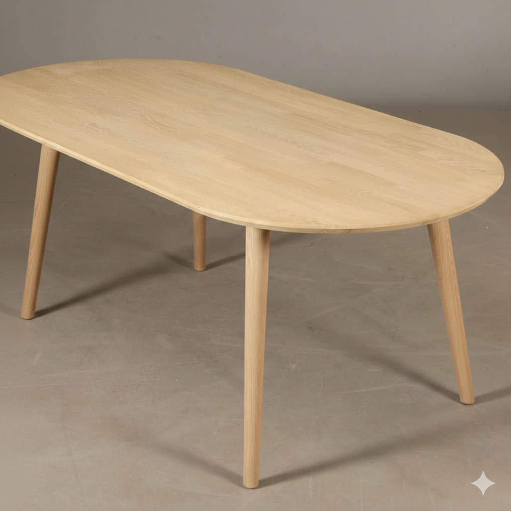 Här säljer vi vårt ovala matbord i massiv ek med robusta ben i ek.