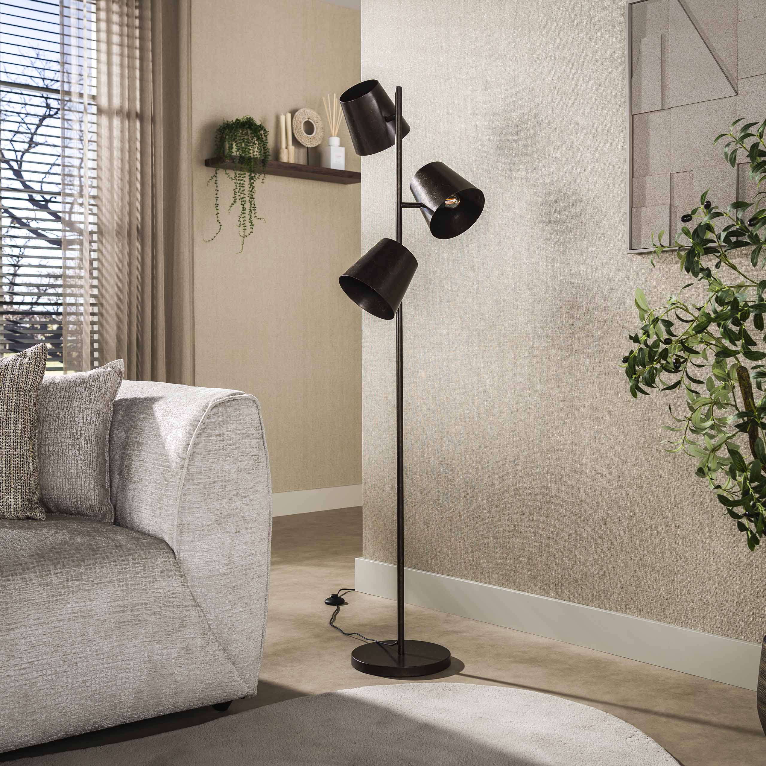 Denna golvlampa har en design där inställningsmöjligheterna är avgörande och avgör utseende och användbarhet.